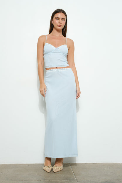 Designed in a dreamy light blue mesh fabric, this high-waisted maxi hugs your curves with just the right amount of stretch. Delicate lace trim and a sweet satin bow detail at the waist give it a feminine finish. Whether paired with the matching cami or styled with your go-to basics, this skirt brings subtle charm to any look
