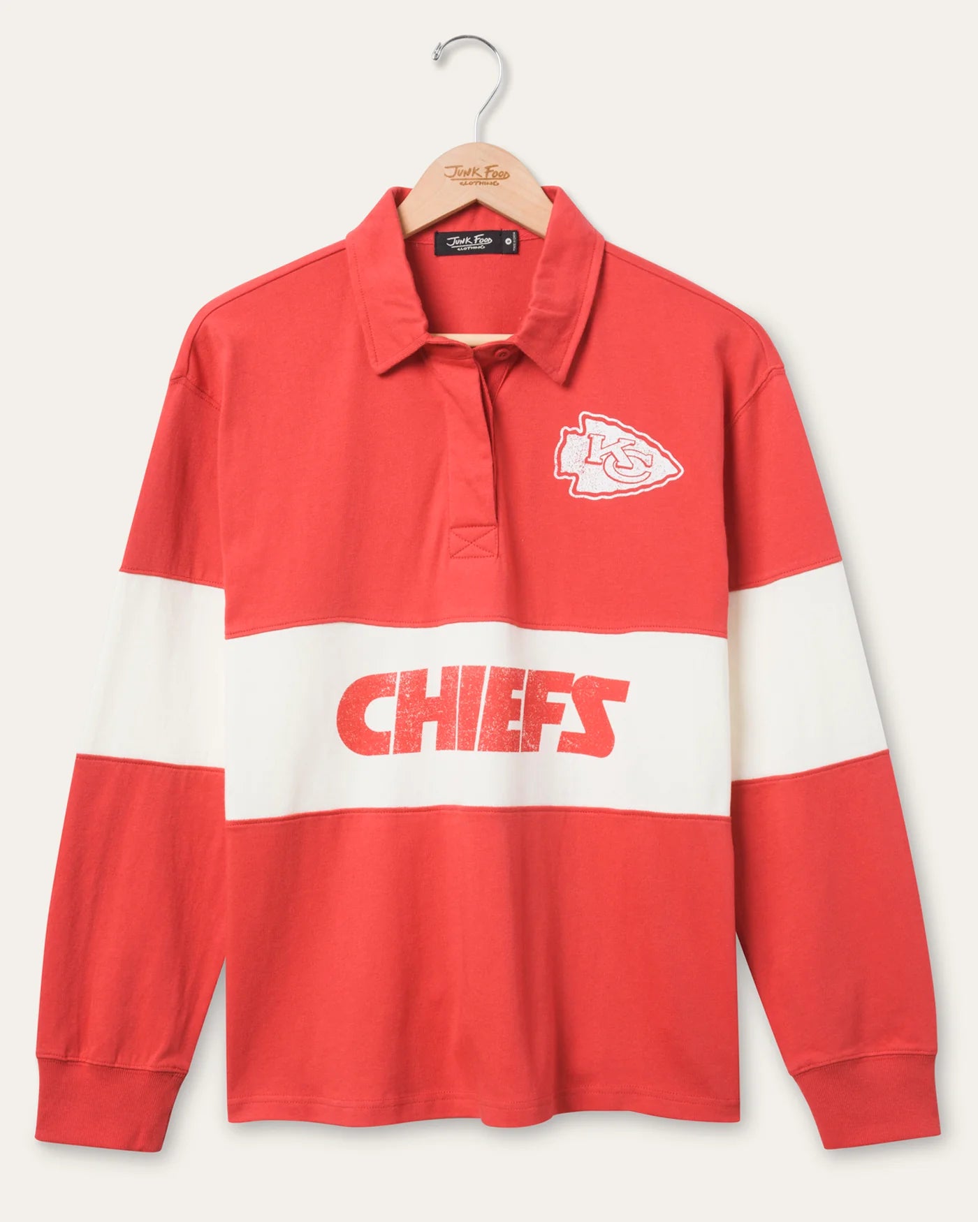 Celebrate your team loyalty with the Women's Kansas City Chiefs Rugby Long Sleeve. Designed with bold stripes and a classic collar, this top showcases “Chiefs” prominently across the chest, merging vintage style with fan enthusiasm. Ideal for cooler game days or relaxed weekends, it offers comfort and a timeless look that highlights your support with expertise and subtle flair.