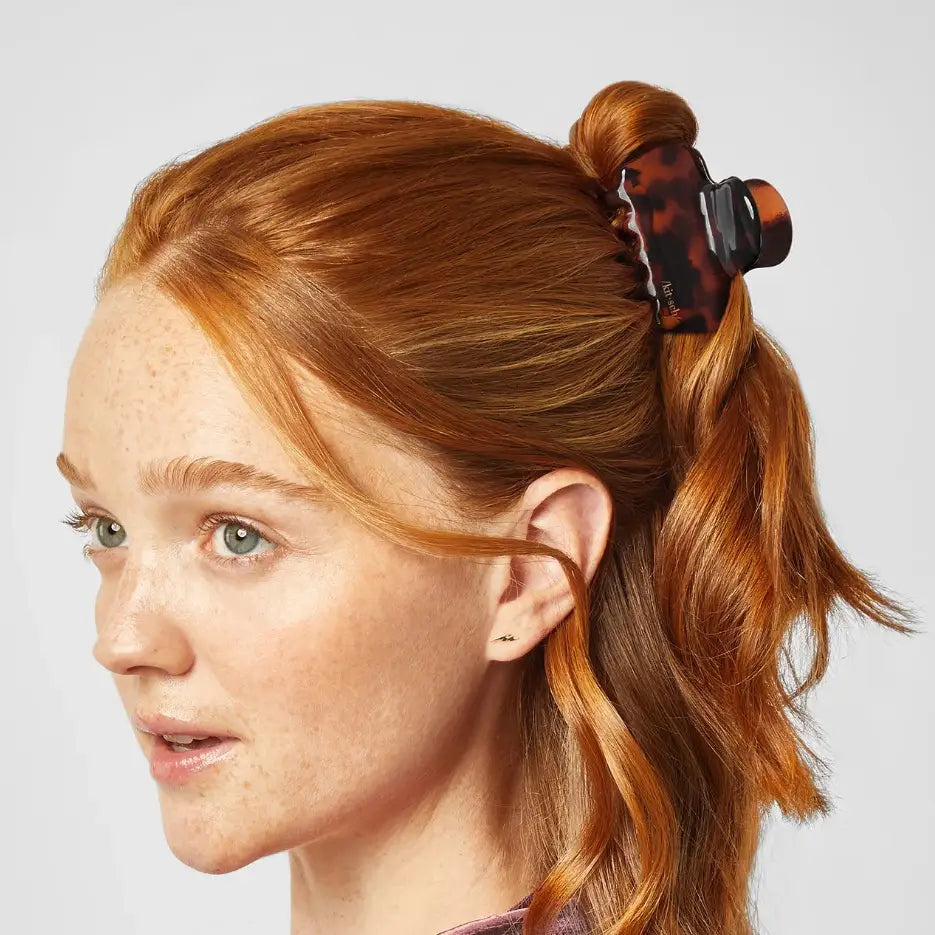 Elevate your hair routine with the Holiday Recycled Plastic Claw Clip in tort. Its large arch shape secures all hair types, from fine to thick curls, in a stylish half-up or full updo. Featuring a unique cloud design and made from recycled plastic, it offers eco-friendly charm perfect for gifting or treating yourself.