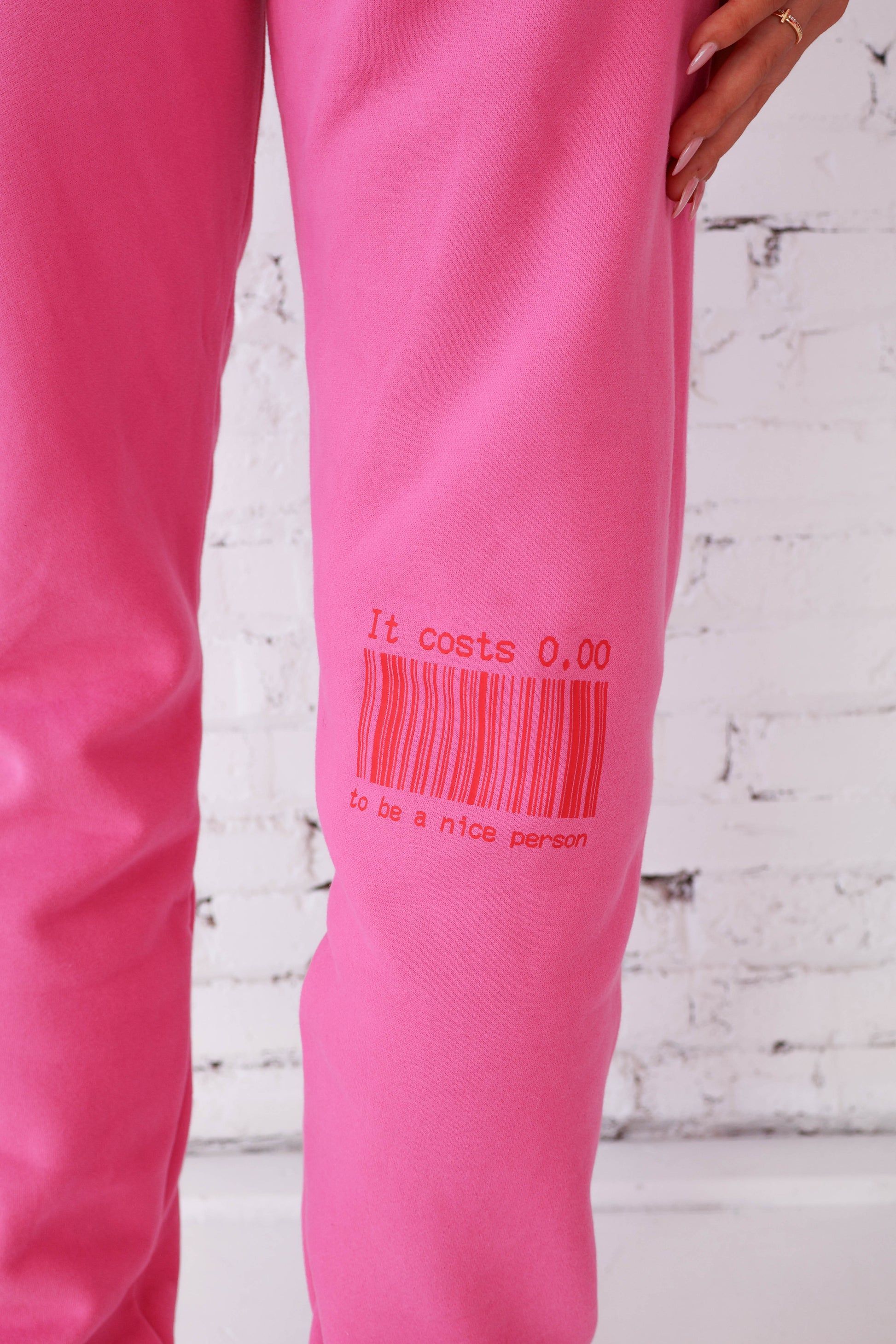 Pink sweatpants with an elastic waistband and side pockets.