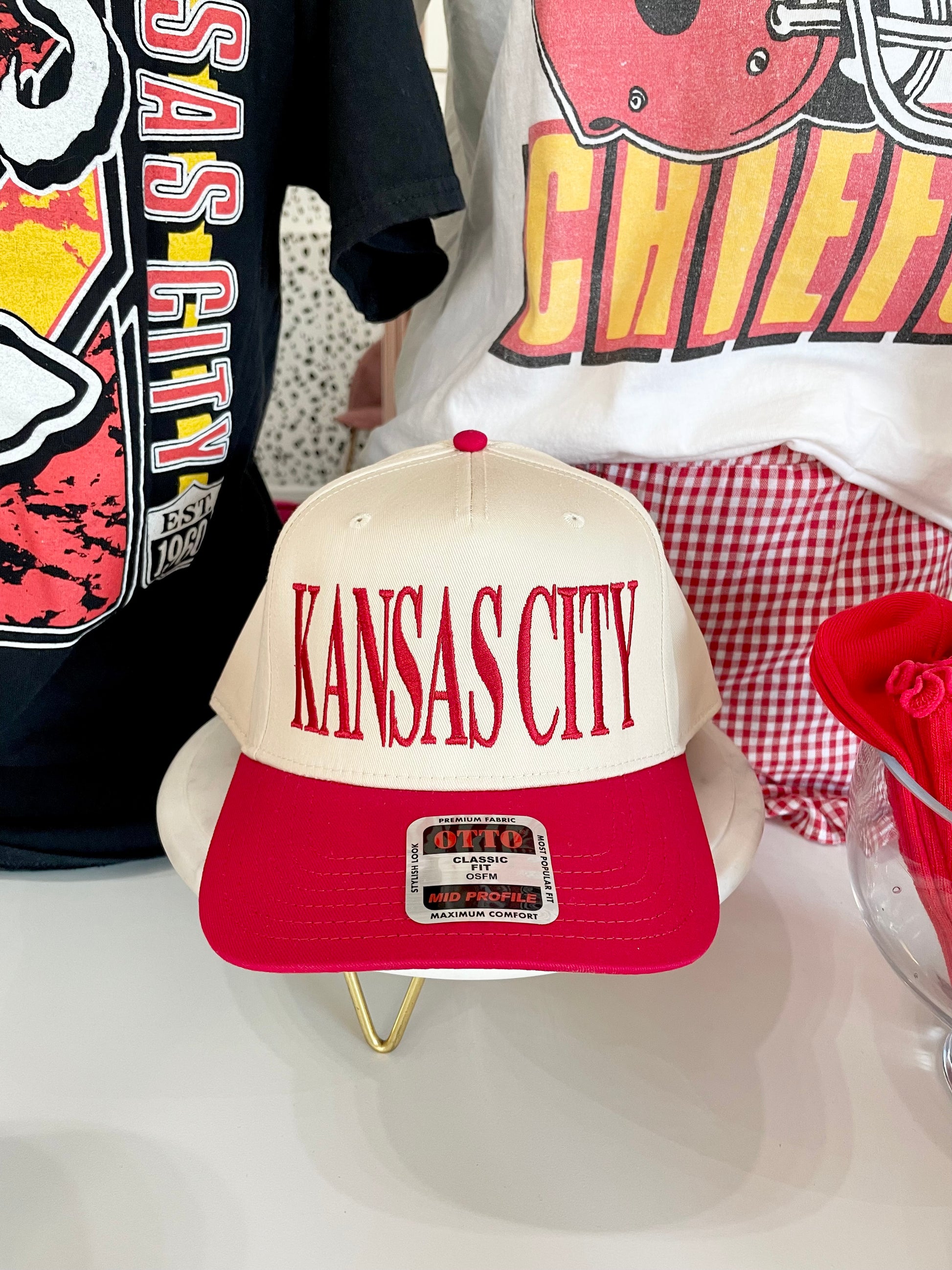 Cream trucker hat with a red bill and "Kansas City" embroidered in red.