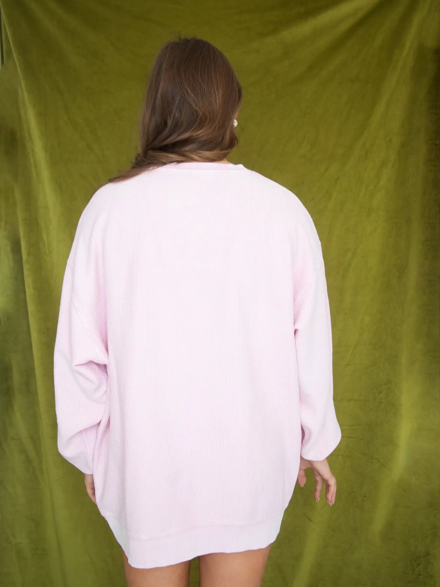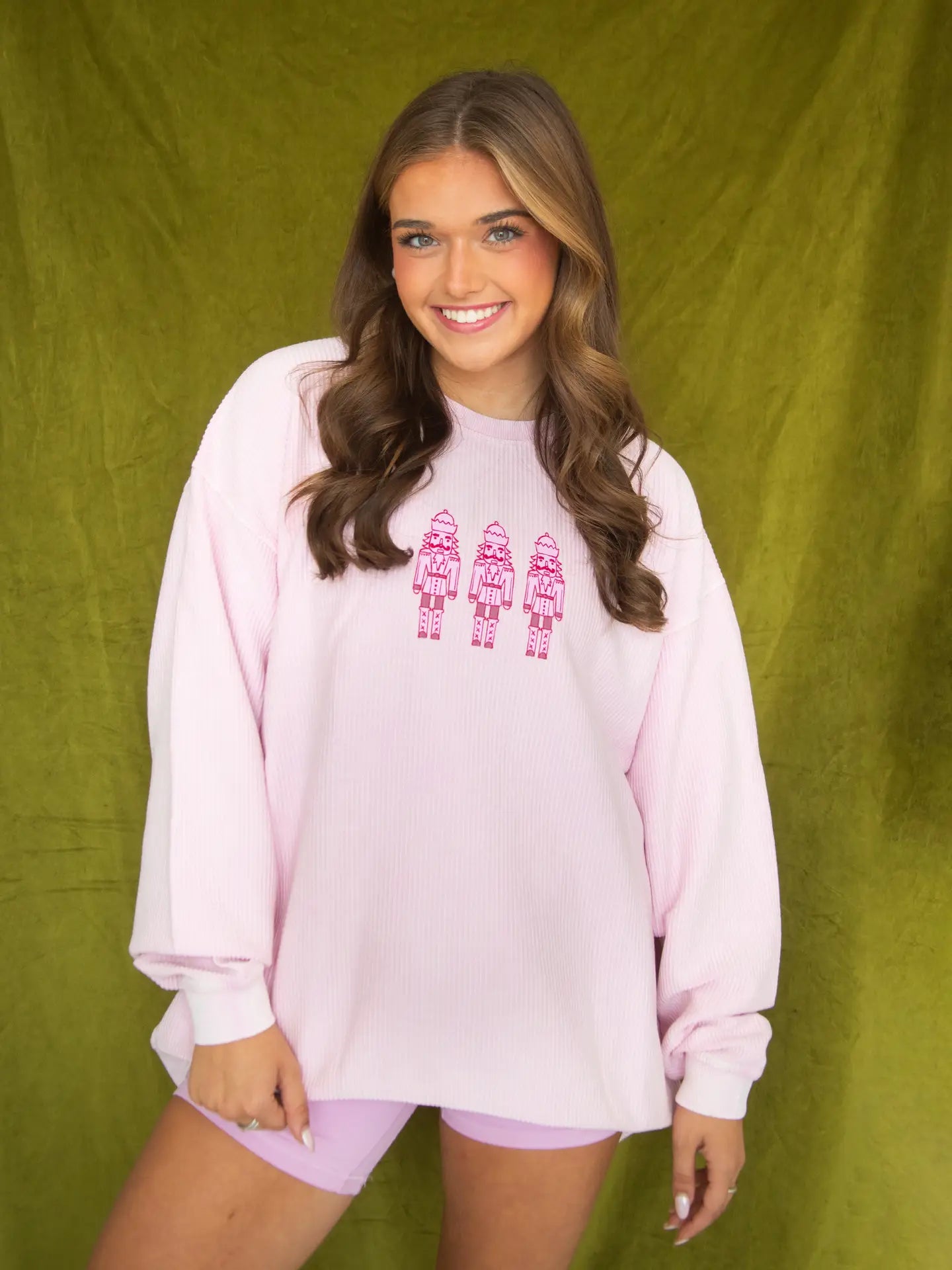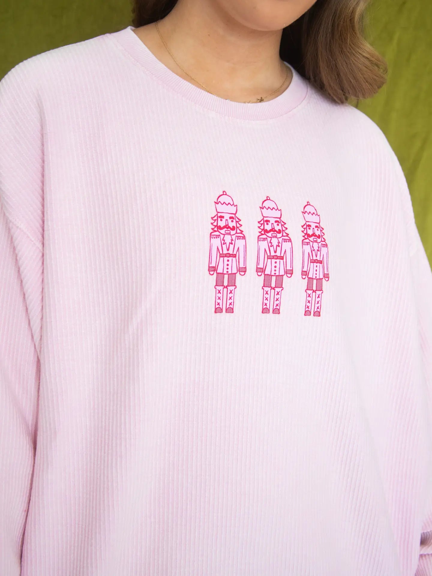 Bring a little ballet magic to your winter wardrobe. This light pink corded crewneck features a trio of pink nutcrackers for a soft, whimsical twist on a holiday classic. Cozy enough for chilly nights, cute enough for festive outings, and made to stand out in a sea of green and red.