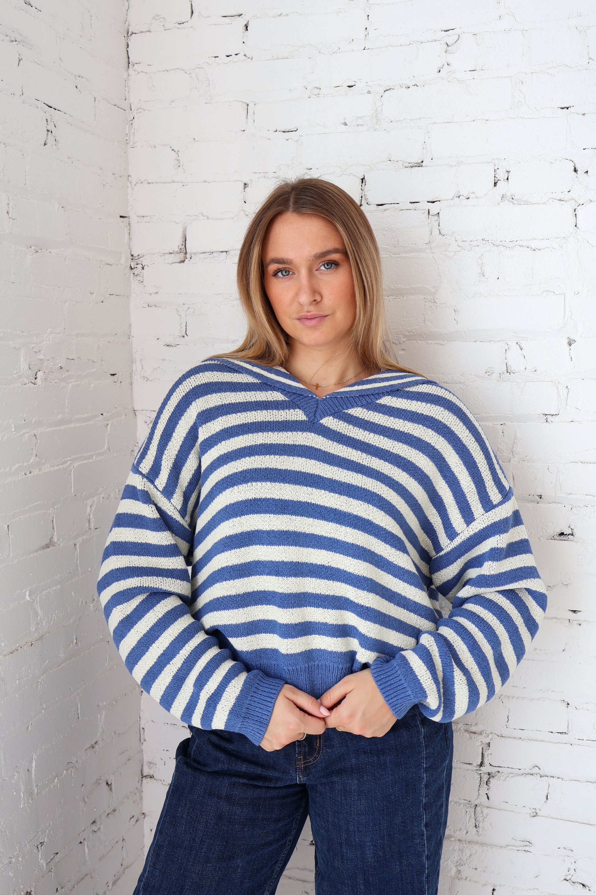 Embrace effortless style with the Sailer Sweater Top, a transitional piece designed for layered comfort. Featuring classic blue and cream stripes and an oversized collar, this sweater offers a relaxed silhouette that works seamlessly from season to season. Perfect for casual weekends or dressed-up occasions, the generous fit provides room to move while maintaining a polished, put-together look.