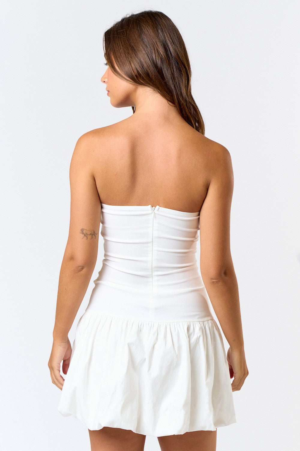 Turn heads in this sleek strapless mini! Featuring a bold V-wire detail for a structured edge, a playful bubble hem for that flirty volume, and a tube dress fit that hugs you just right—this little white dress is made for making statements.