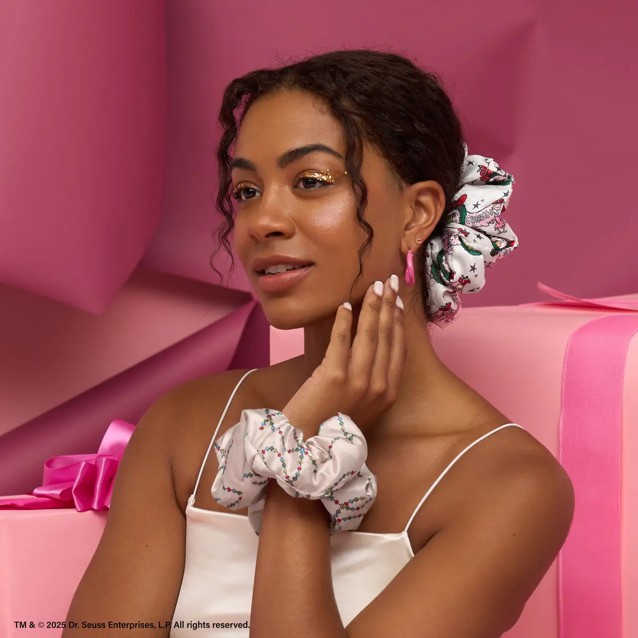 Two luxe, limited-edition satin scrunchies inspired by The Grinch bring festive fun to your beauty sleep and beyond. These ultra-soft, oversized scrunchies are gentle on strands while offering an innovative alternative to traditional elastics—no tugging, snagging, or creasing. Elevate your nightly routine with holiday-inspired style.