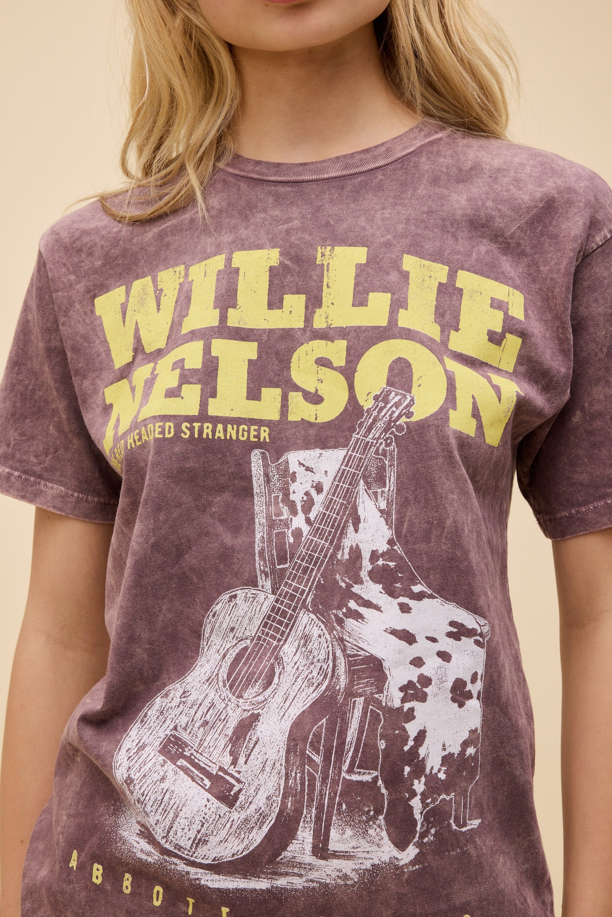 Celebrate country music royalty with this acid wash Weekend Tee honoring Willie Nelson's iconic "Red Headed Stranger" album. The design features Trigger, Nelson's legendary guitar, rendered in a bold graphic across the chest, complemented by authentic cowhide accents. A true collector's piece for fans of the Abbott, Texas legend and classic Americana style.